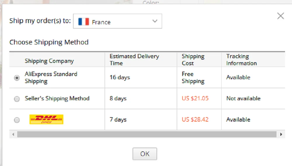 نرسل عادة منتجاتنا عن طريق الشحن القياسي AliExpress. إنها طريقة شحن آمنة، ولكنها بطيئة بعض الشيء. عادة ما يستغرق الوصول 20-40 يومًا (يعتمد على الوجهة). إذا كنت بحاجة إلى فستانك على عجل، الرجاء اختيار طريقة الشحن السريع، مثل DHL، FedEx. عند تقديم الطلب، يمكنك رؤية اختيار اختيار مثل الصورة أدناه، ولكنه ليس دقيقًا جدًا، فهو عرض تلقائي بواسطة نظام علي. إذا كان لديك أي طلب حول طريقة الشحن، الرجاء الاتصال بنا. وسوف نقترح أفضل طريقة بالنسبة لك.